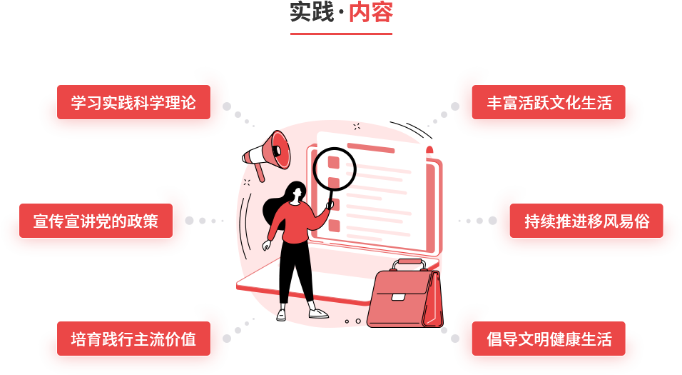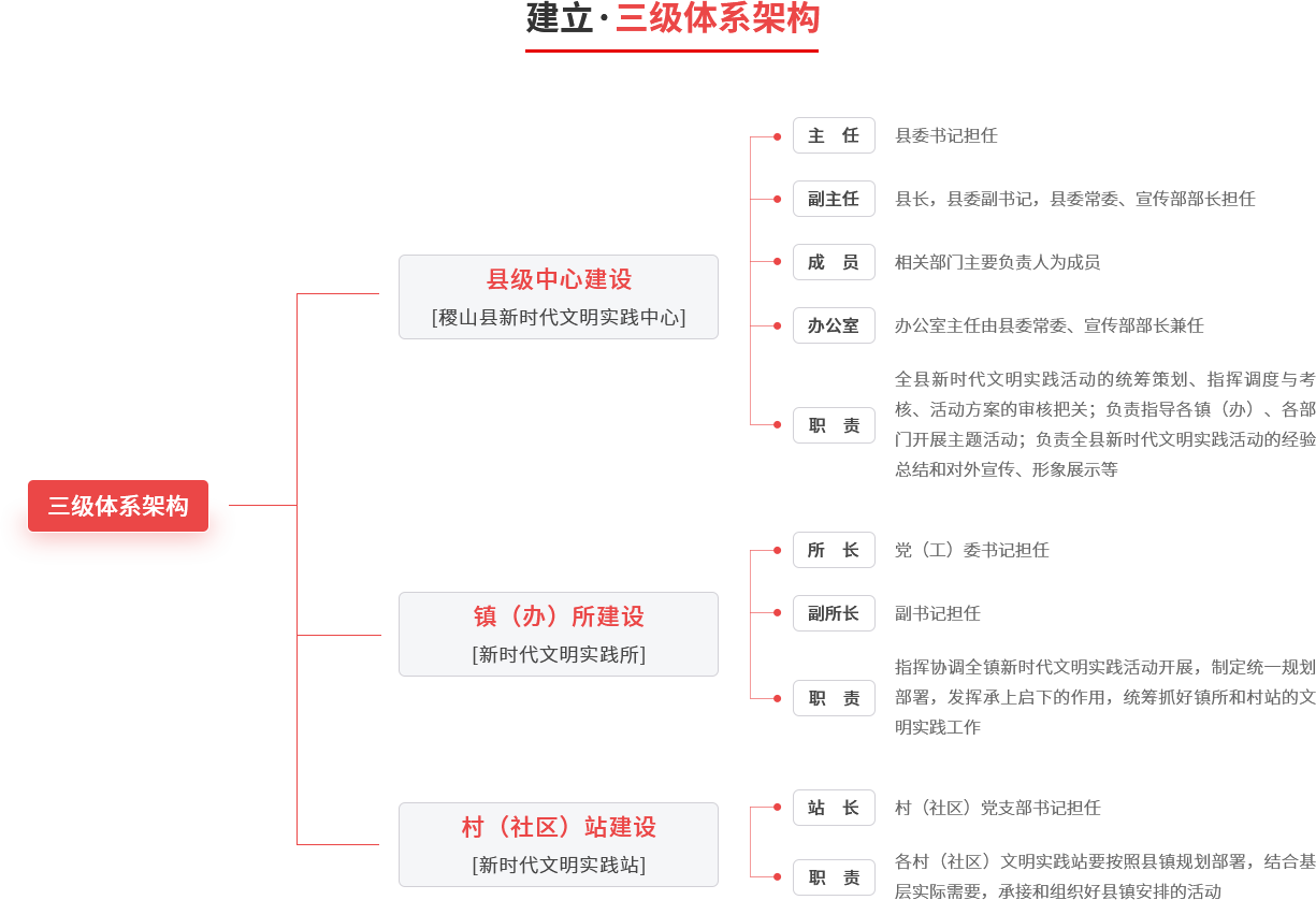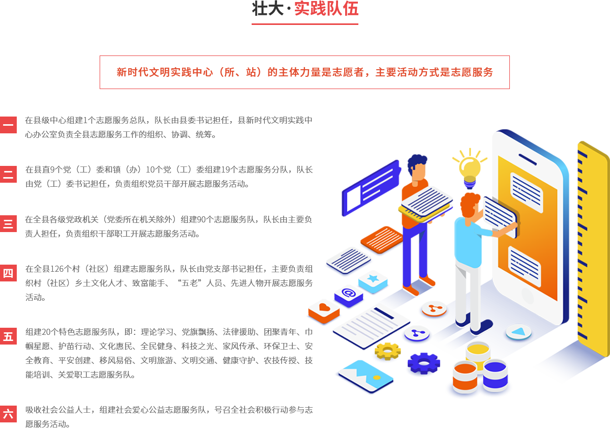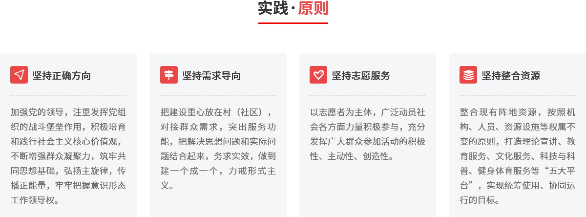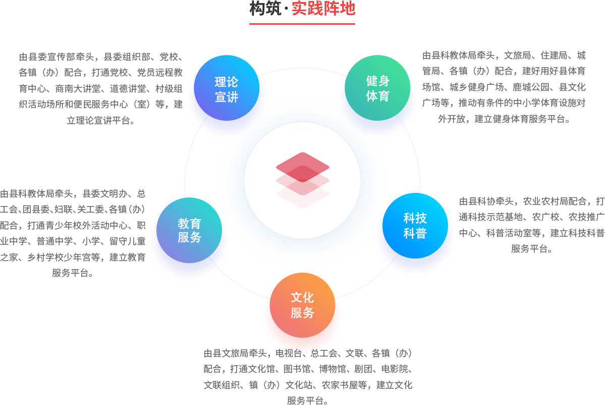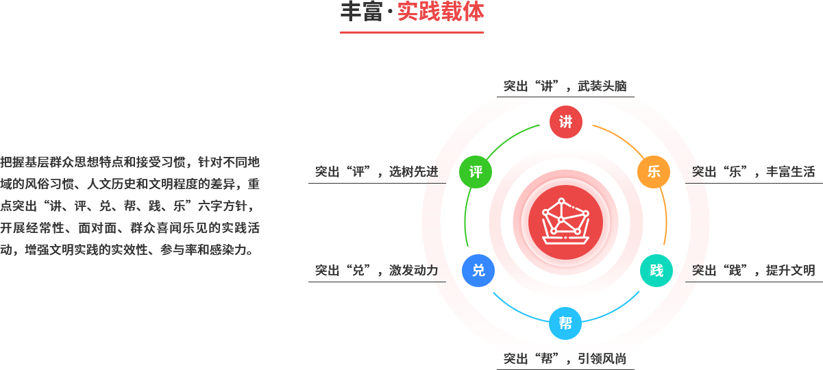 以县域为整体,城乡统筹推进。以县、镇(办)、村(社区)三级为单元,充分发挥志愿服务作用,大力建设新时代文明实践中心,将其作为宣传普及习近平新时代中国特色社会主义思想、培育践行社会主义核心价值观的主阵地,深入实施乡村振兴战略、加快乡村文化振兴的重要抓手,打造融思想引领、道德教化、文化传承等多种功能于一体的综合平台,充分凝聚群众、引导群众,以文化人、成风化俗,实现群众在哪里,文明实践就延伸到哪里。